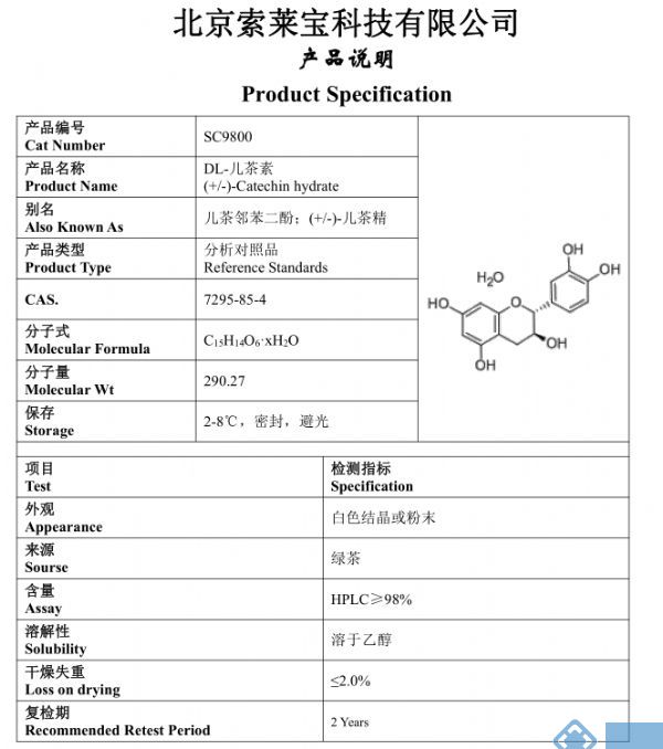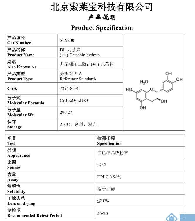 产品名称: (+/-)-Catechin hydrate;DL-儿茶素